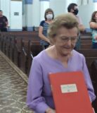 Uma das paroquianas do Santuário com o Livro Tombo da Paróquia. Foto: Pascom do Santuário.