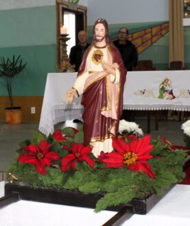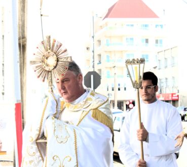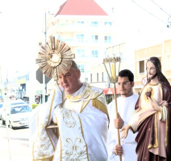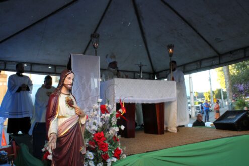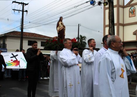 Saída da procissão com a imagem do Sagrado Coração de Jesus, em frente à Paróquia Sagrada Família de Nazaré