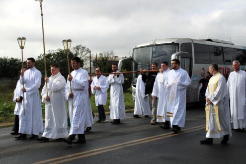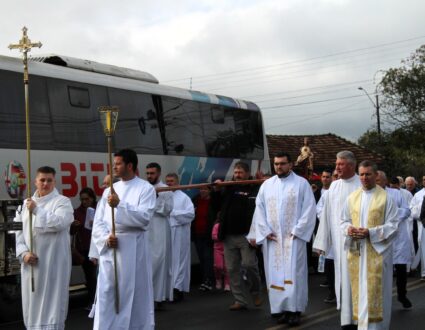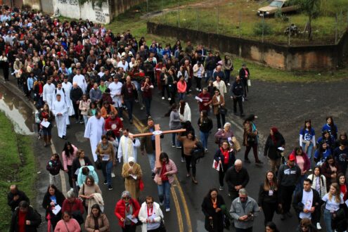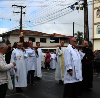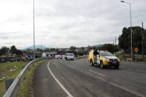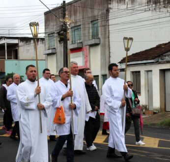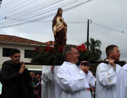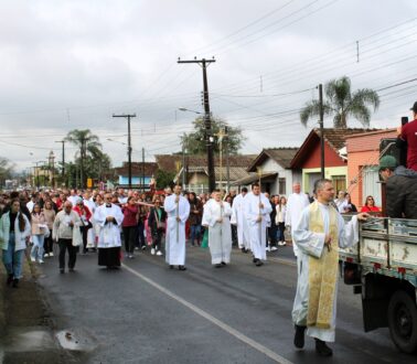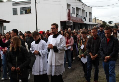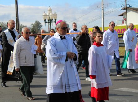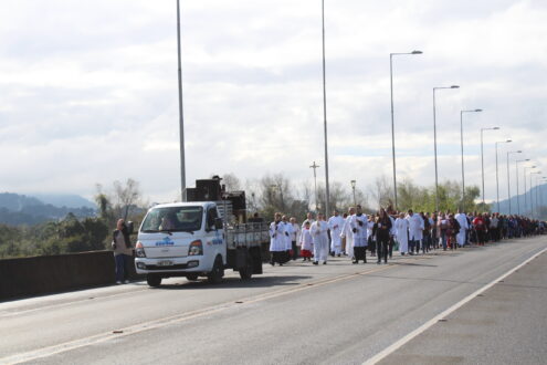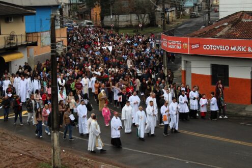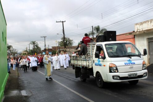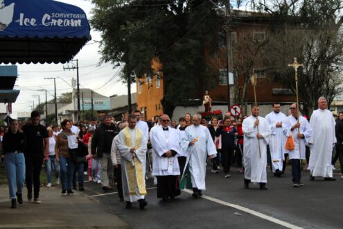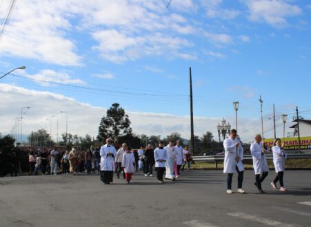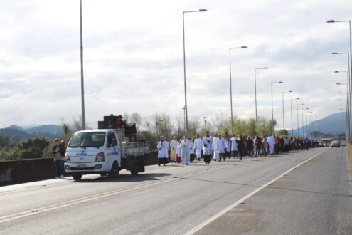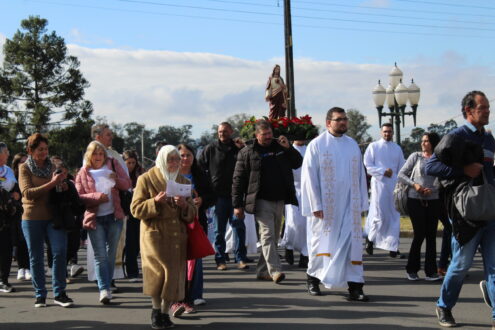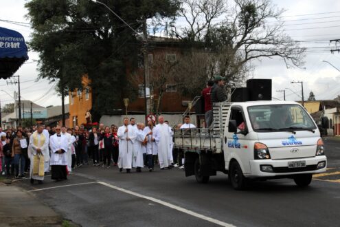 Às 9h30, teve início a peregrinação saindo da Paróquia Sagrada Família de Nazaré, até a Catedral Sagrado Coração de Jesus, conduzida pelos padres Cristian Boniatti e Douglas Ribasz, com os fiéis entoando cânticos, rezando e dando testemunho de fé ao longo do trajeto. Moradores locais acompanharam com devoção, muitos emocionados ao ver a expressão viva da fé de sua comunidade.
