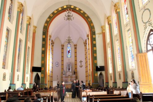 A chegada à Catedral Sagrado Coração de Jesus aconteceu por volta das 10h30, onde os romeiros foram acolhidos em clima de adoração e silêncio orante.