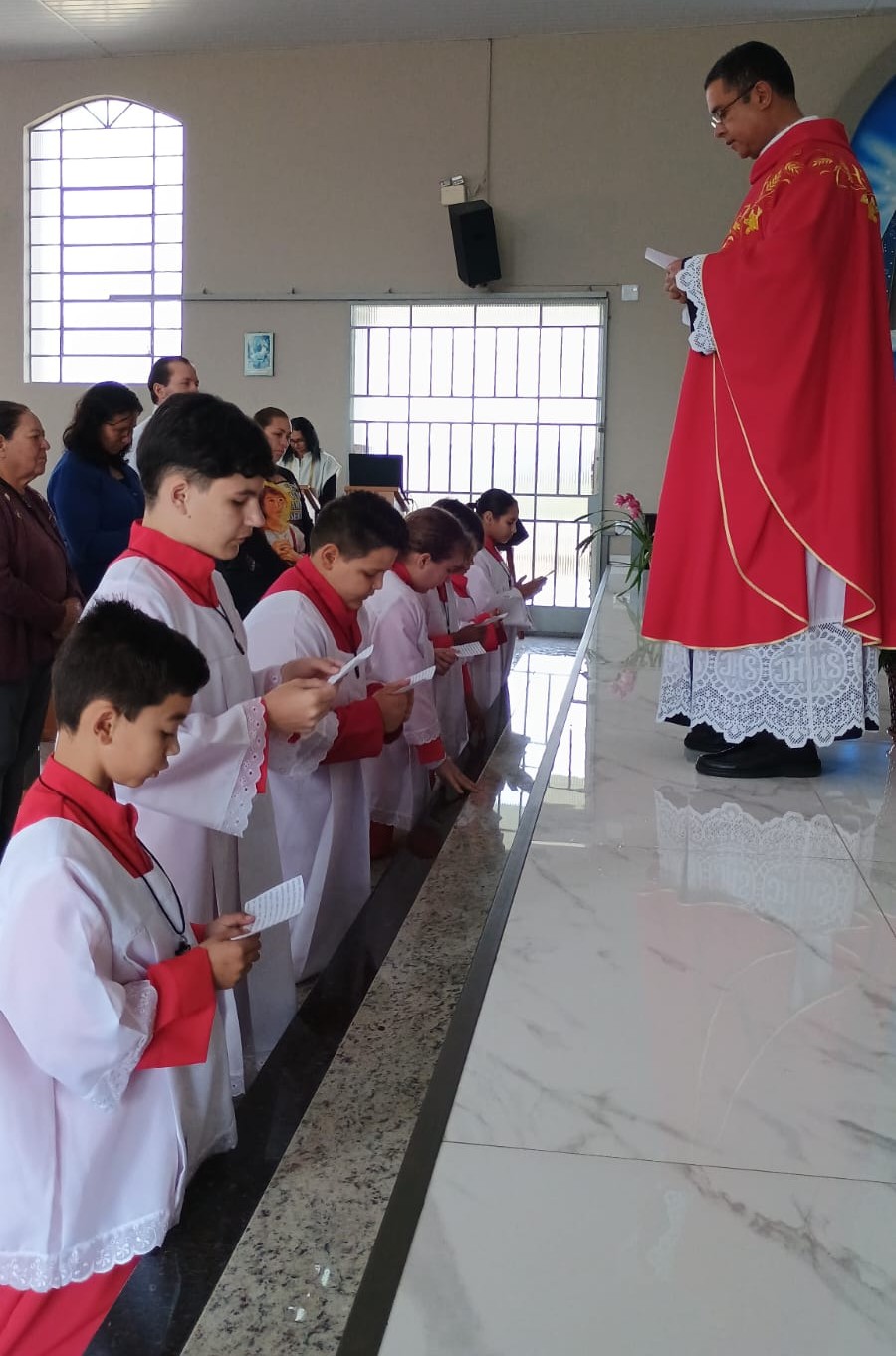 Durante a celebração, os novos coroinhas receberam suas vestes litúrgicas, símbolo do serviço ao altar e da pureza de coração que devem cultivar. A comunidade participou com entusiasmo, rezando por cada um deles e renovando seu compromisso de apoio e incentivo aos que assumem esse importante ministério.