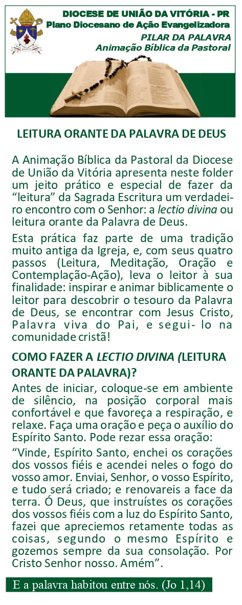 A Diocese de União da Vitória disponibiliza aos fiéis o material da Leitura Orante da Palavra de Deus, um subsídio que ajuda comunidades, pastorais e famílias a viverem um verdadeiro encontro com o Senhor por meio das Escrituras.