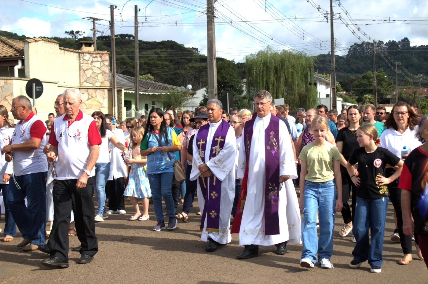 Padres e fiéis peregrinando a caminho da Matriz