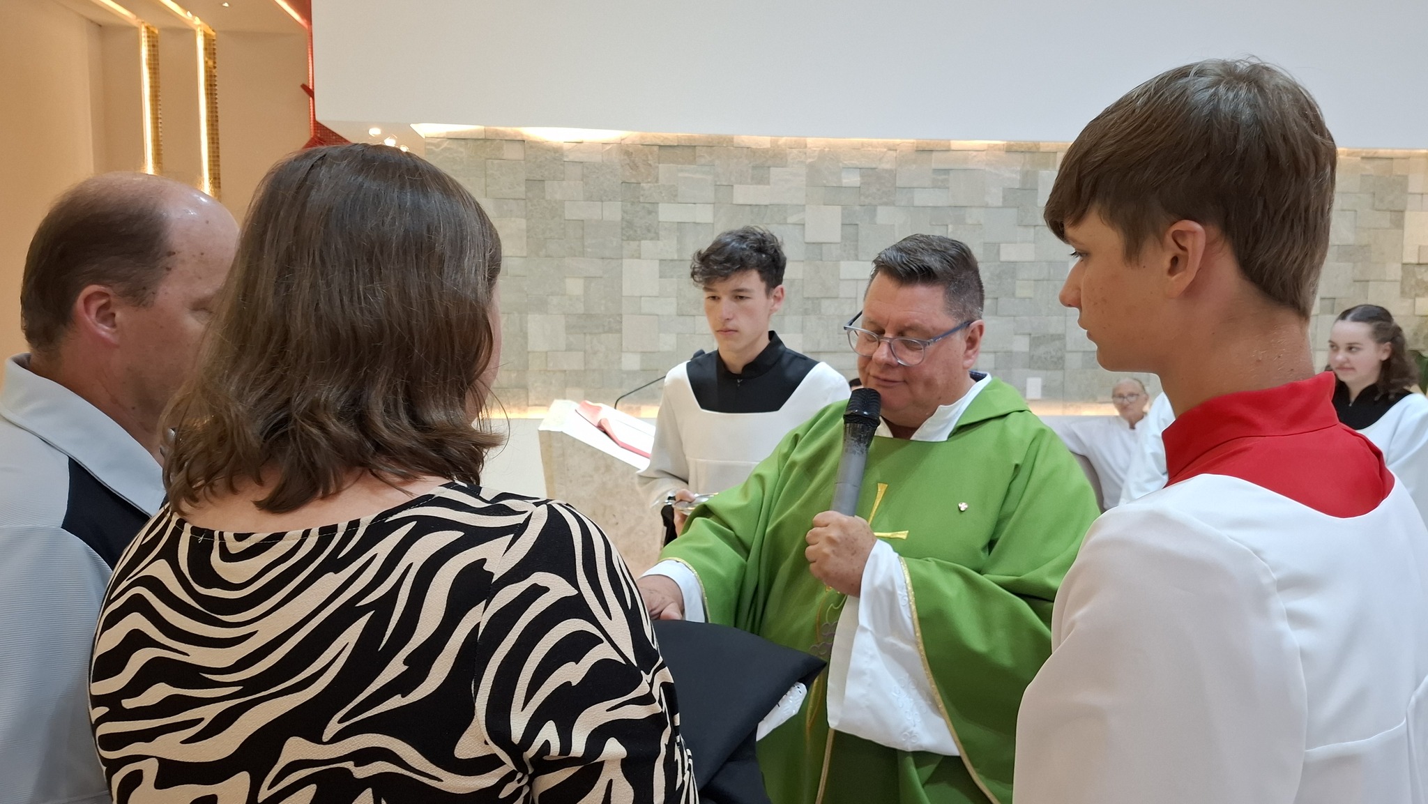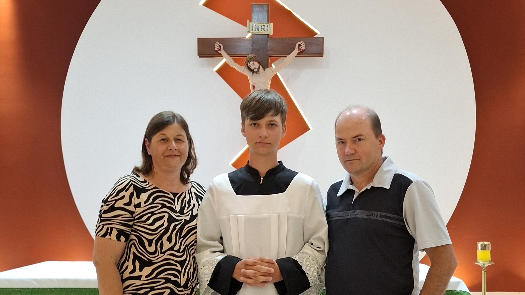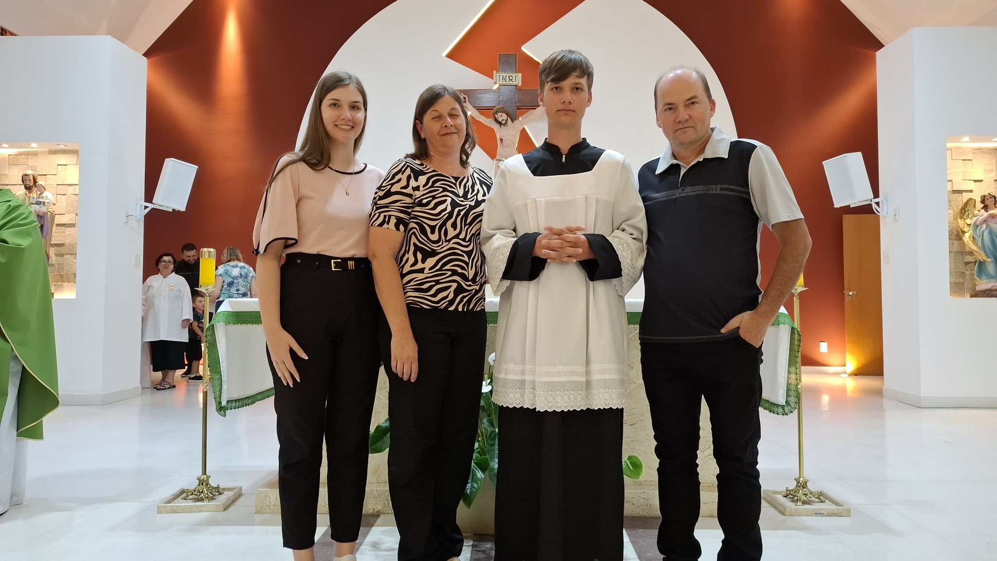 Um momento especial da cerimônia foi a entrega das vestes litúrgicas pelos pais de Davi, Sílvia e Waldecir, previamente abençoadas pelo sacerdote, simbolizando o apoio e a presença da família nessa etapa tão significativa de sua caminhada cristã. Também esteve presente sua irmã, Ana Luísa, reforçando a importância do núcleo familiar no discernimento vocacional e na formação espiritual.