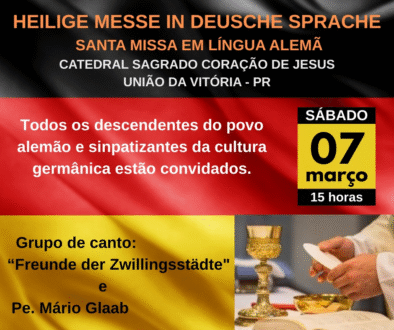 Temos a satisfação de anunciar mais uma missa rezada e cantada totalmente em língua alemã. Será a primeira do ano de 2026. Como já estamos fazendo por oito anos, desde 2018, a cada dois ou três meses, oferecemos esta possibilidade para os fiéis das nossas cidades. Desta vez será no dia 07 de março às 15 horas, na Catedral Sagrado Coração de Jesus de União da Vitória. A celebração será presidida pelo Pe. Mário F. Glaab e cantada pelo Grupo de Cantos “Freunde der Zwillinsstädte” (Amigos das Cidades Gêmeas).